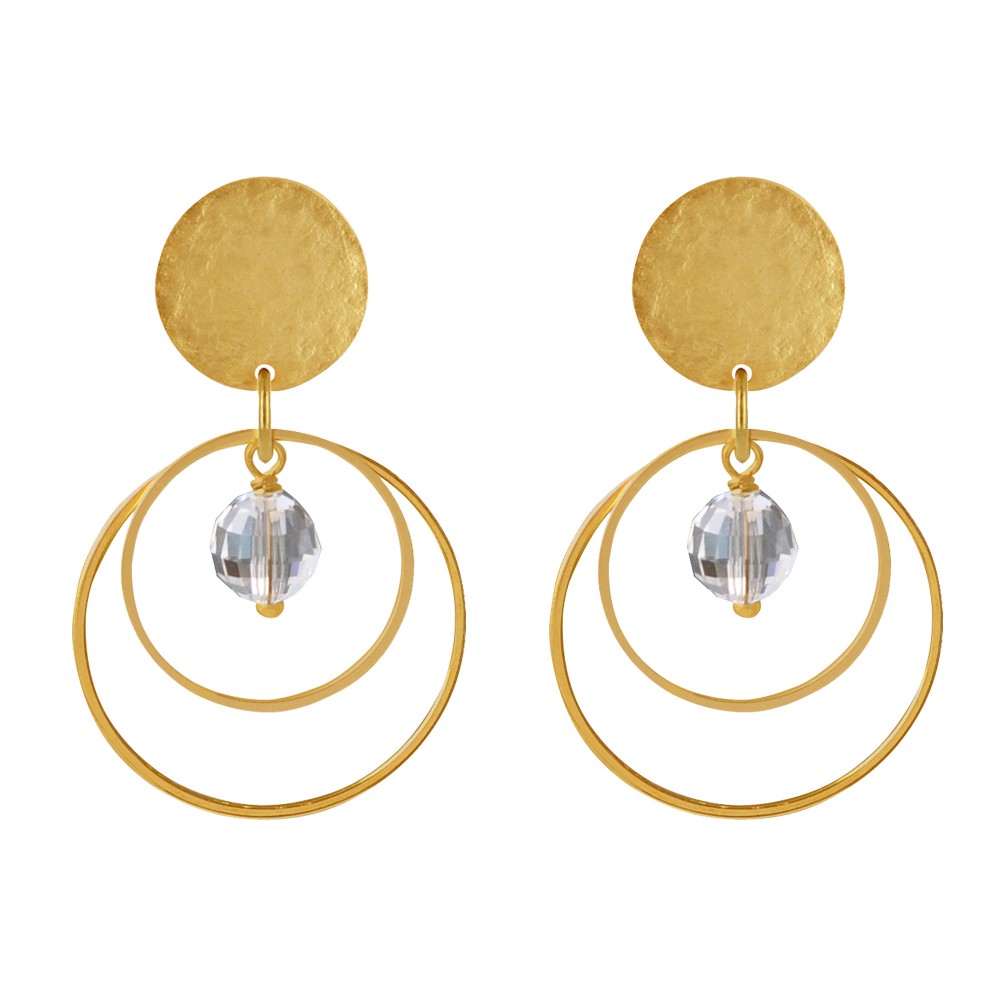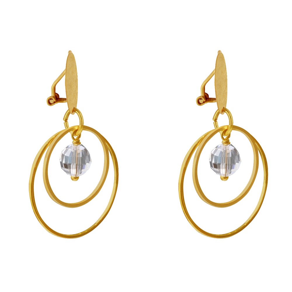 Boucles d'Oreilles Clip Laiton Mat Pastille Brossée Deux Anneaux et Perle Facettée