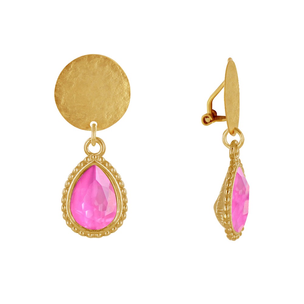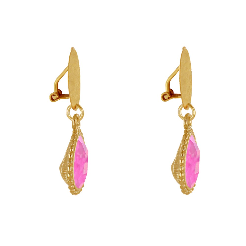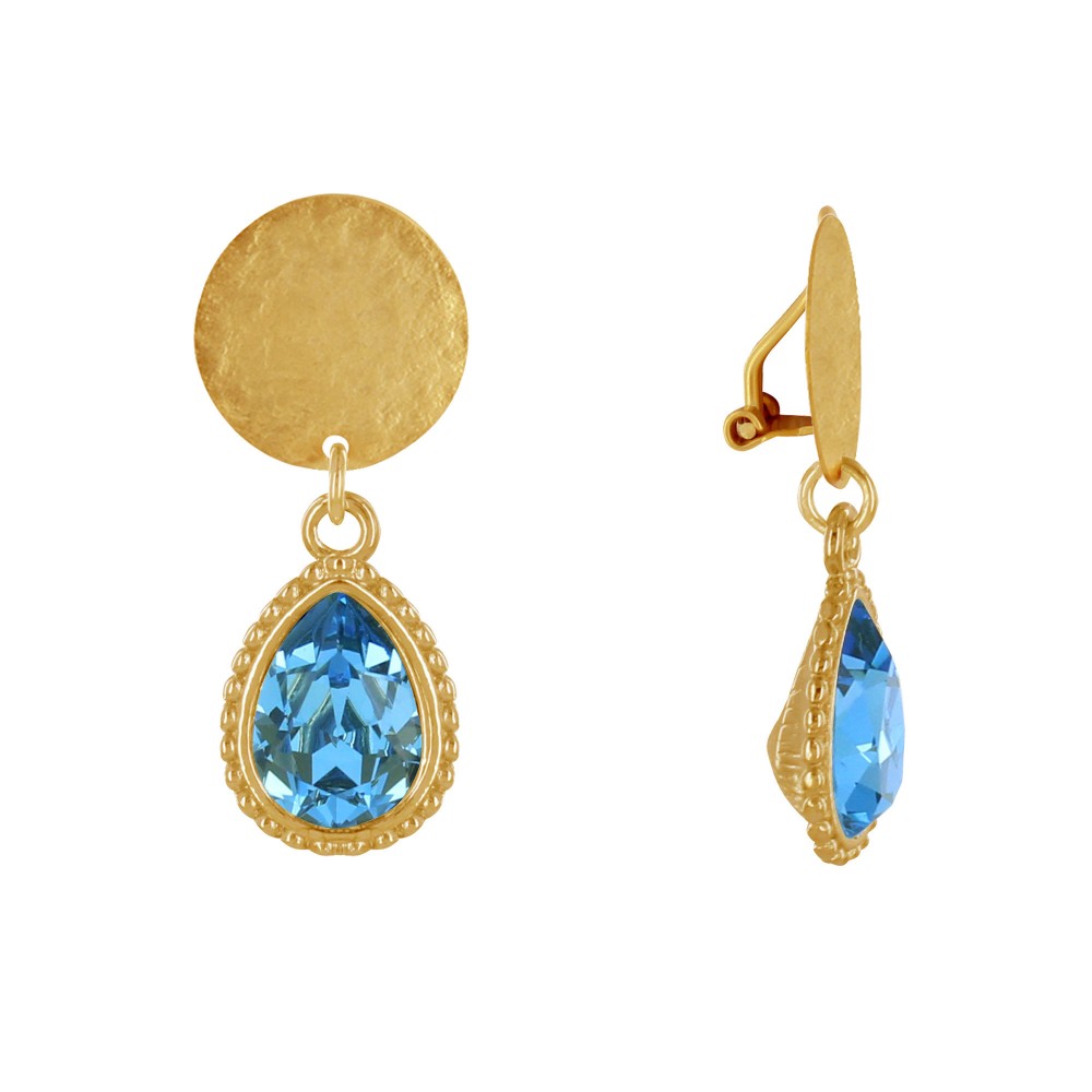 Boucles d'Oreilles Clips Laiton Doré Pastille Brossée et Goutte Cristal