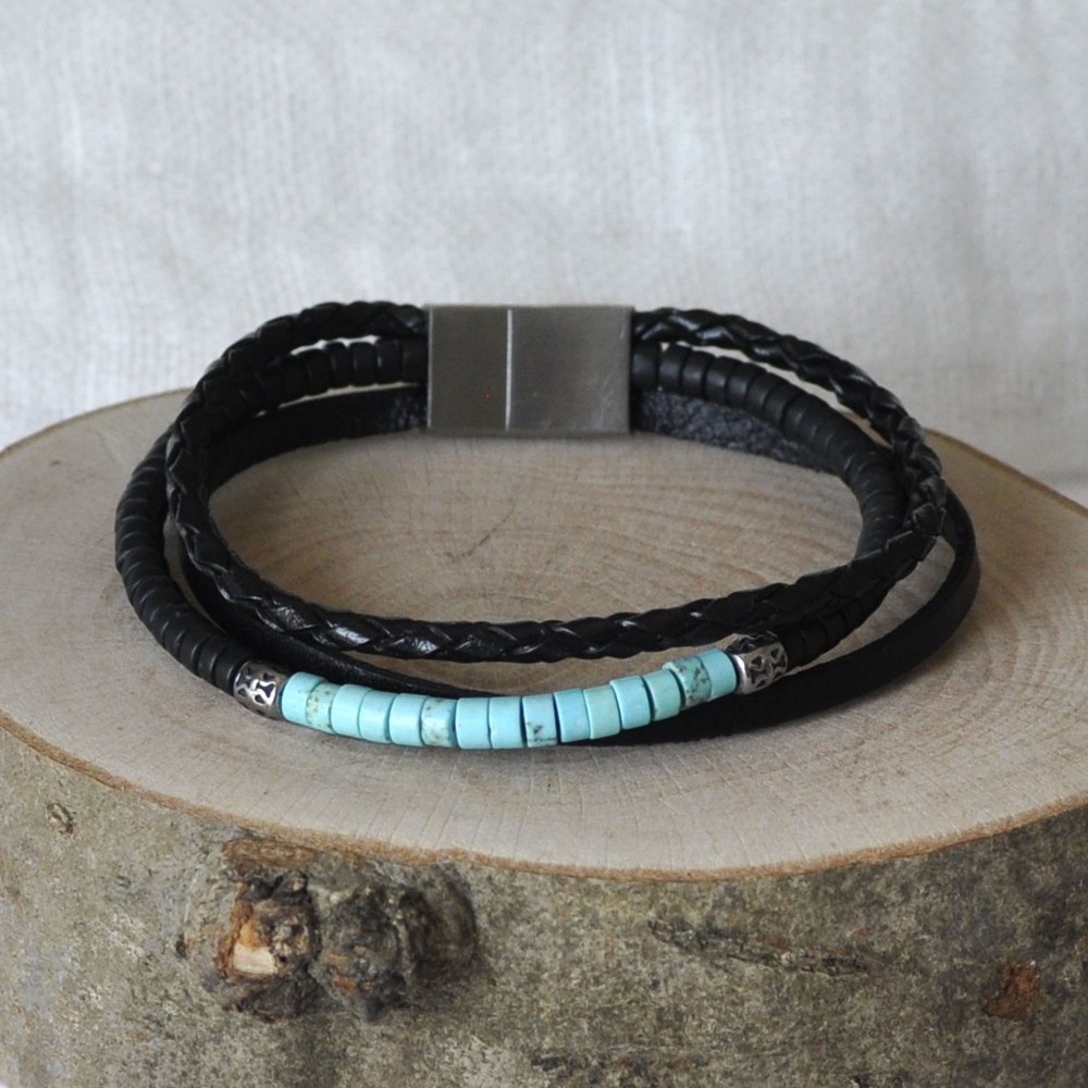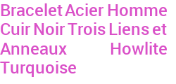 Bracelet Acier Homme Cuir Noir Trois Liens et Anneaux Howlite Turquoise