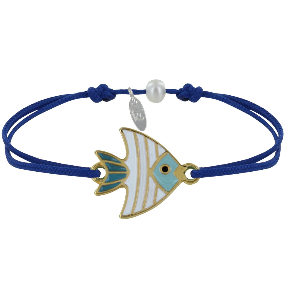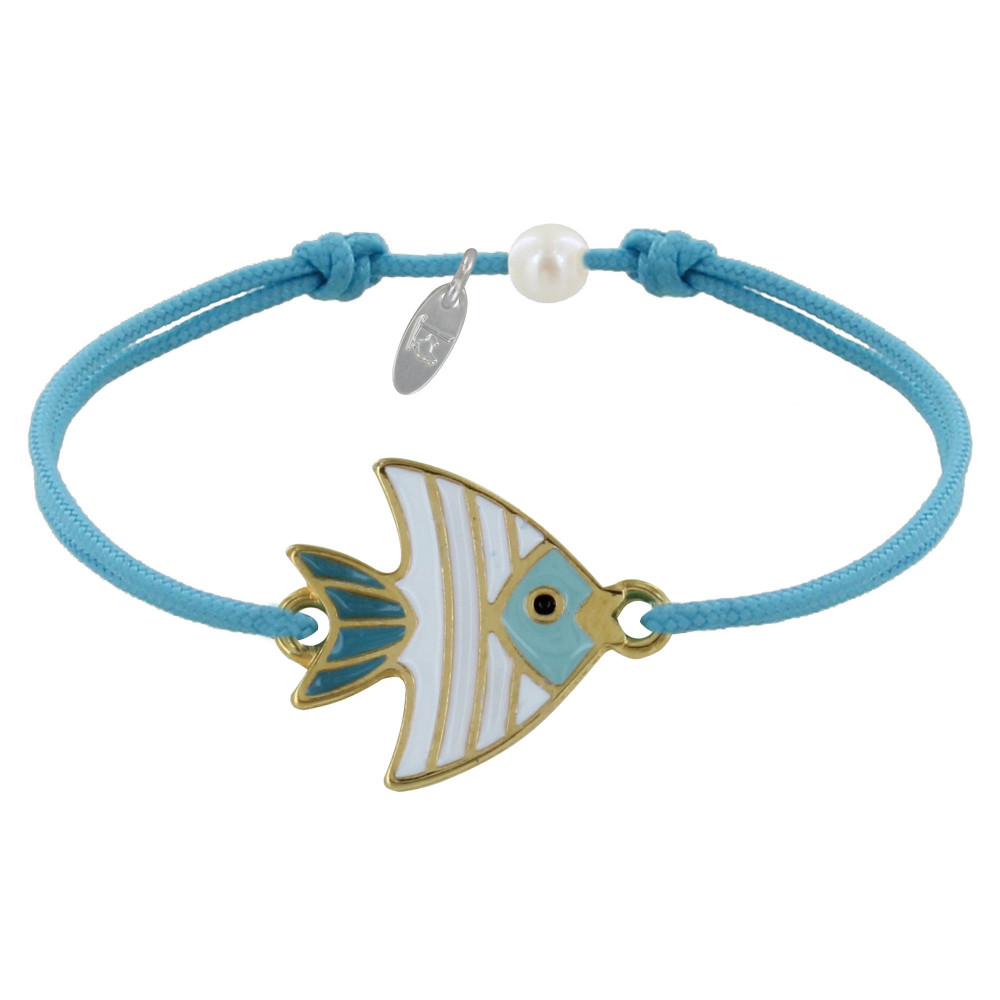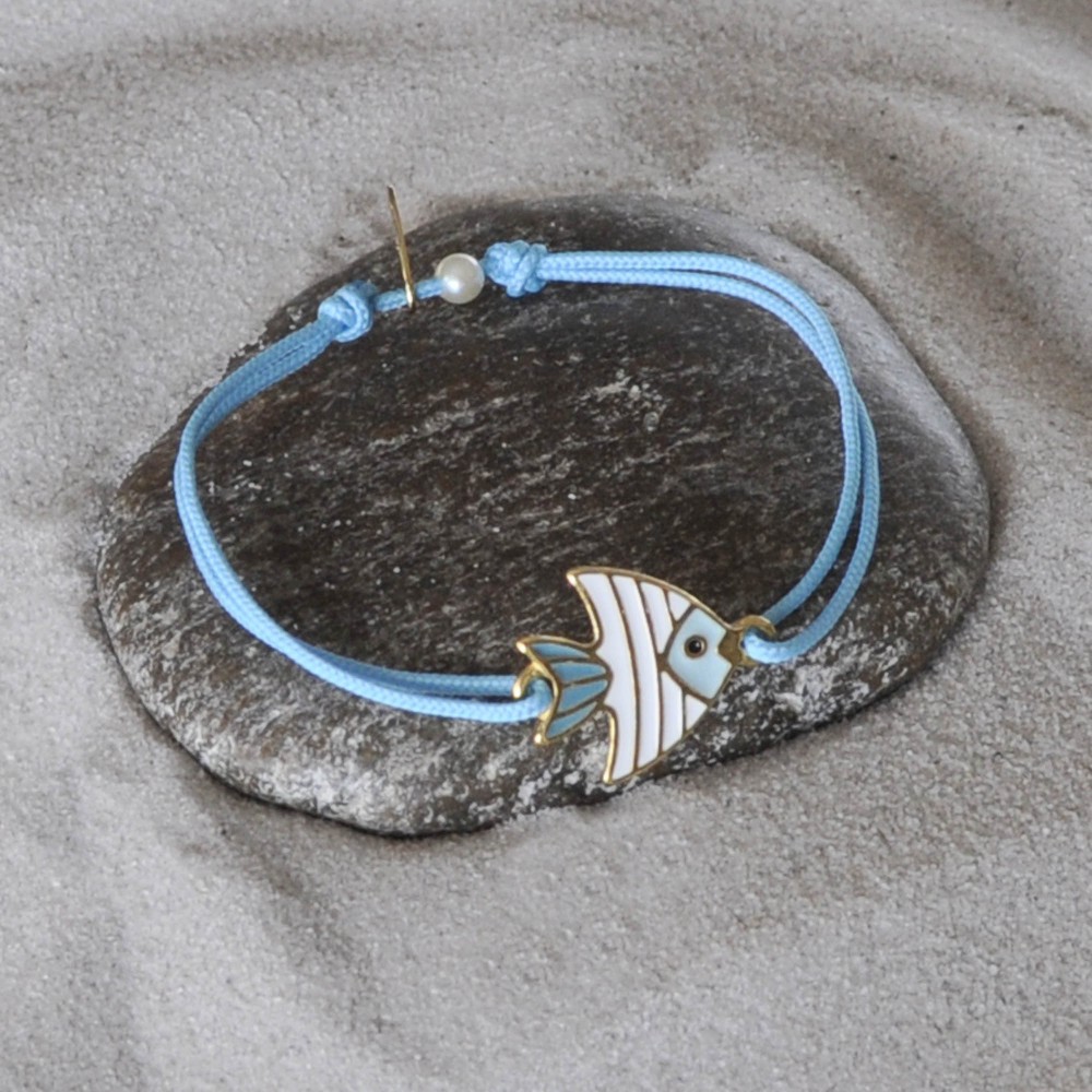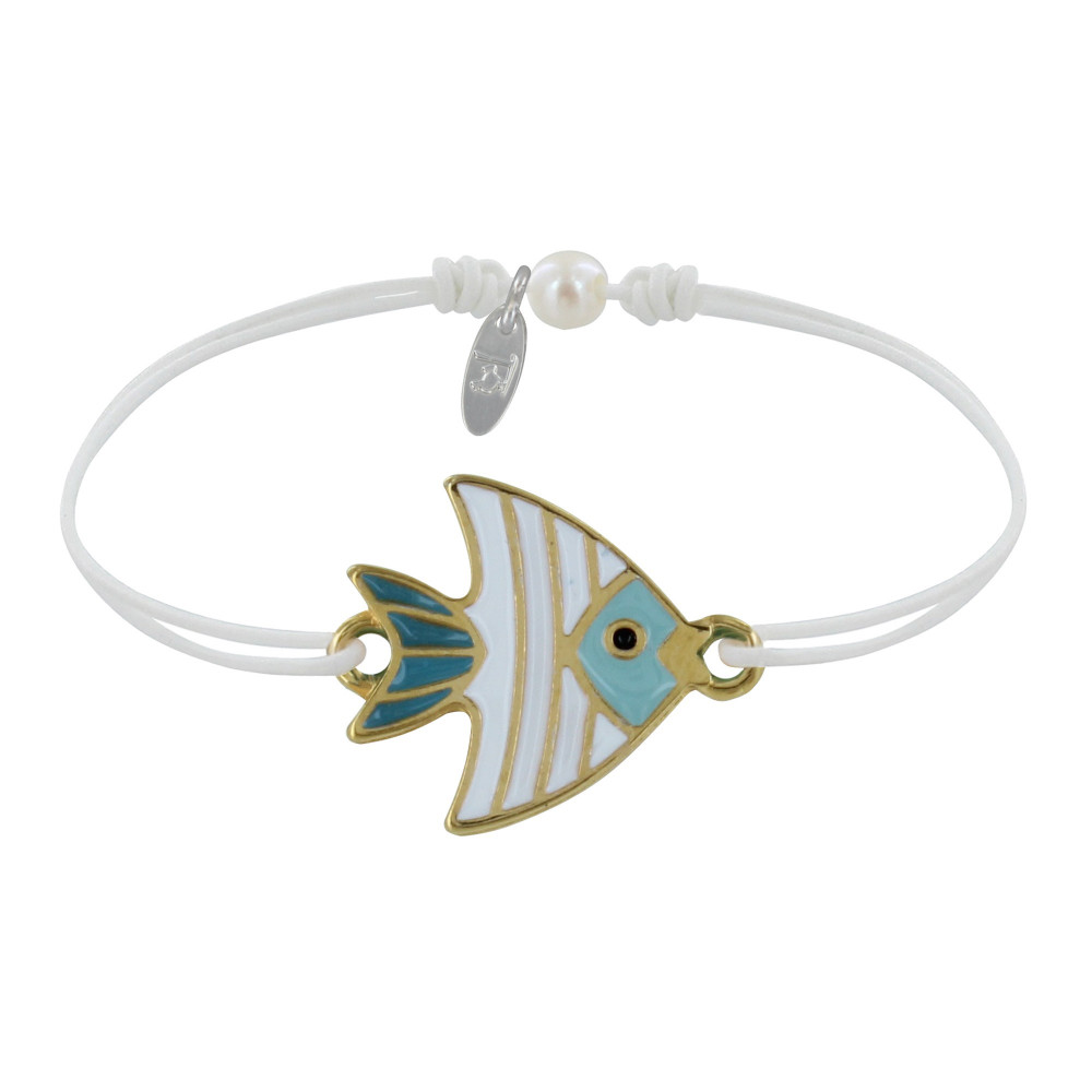 Bracelet Lien Médaille en Laiton Poisson Émaillée Blanche et Turquoise